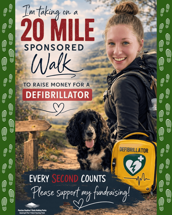 🥾 Grace (accompanied by Jetta of course!) has decided to participate in the Bala Challenge 20 mile walk on Saturday 9th May in order to raise money for a defibrillator at Pen Y Bont Touring Park.